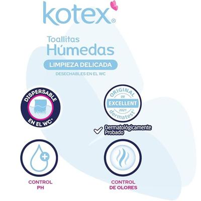 Mantente limpia y fresca todos los días con las toallitas húmedas Kotex Limpieza Delicada, son prácticas e ideales para llevar en todo momento. Son de uso diario, cuentan con control de olores y de pH, son hipoalergénicas, libres de parabenos y sin alcohol, además están dermatológicamente probadas. Las toallitas húmedas de Kotex son las únicas toallitas desechables en el WC.