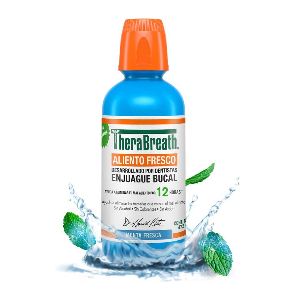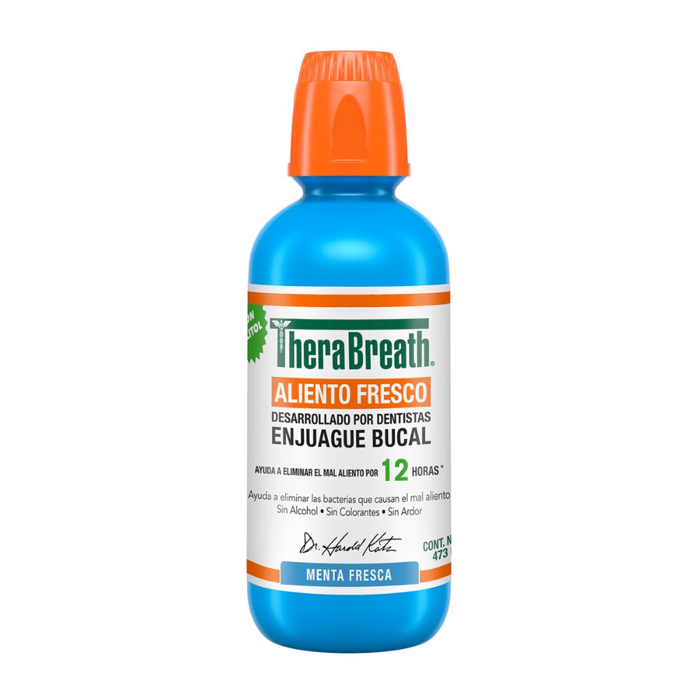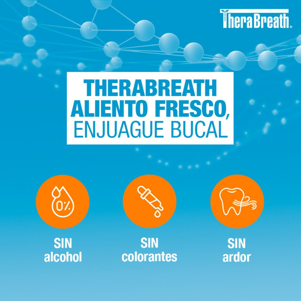 Protege tu boca contra el mal aliento hasta por 12 horas con TheraBreath Menta Fresca, el enjuague bucal sin alcohol y sin ardor que ayuda a eliminar las bacterias que causan el mal aliento. Su fórmula desarrollada por dentistas no contiene sabores ni colorantes artificiales, es vegana, sin gluten y cumple con estándares Kosher.
