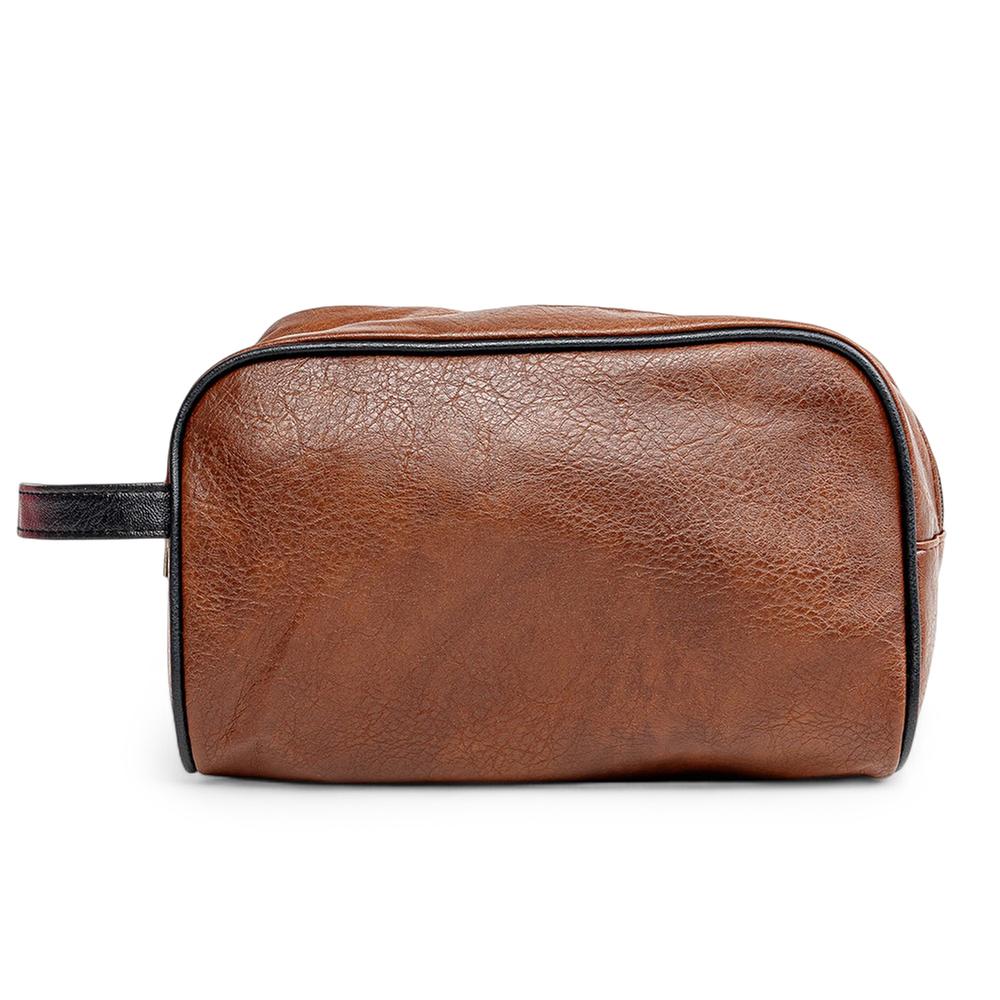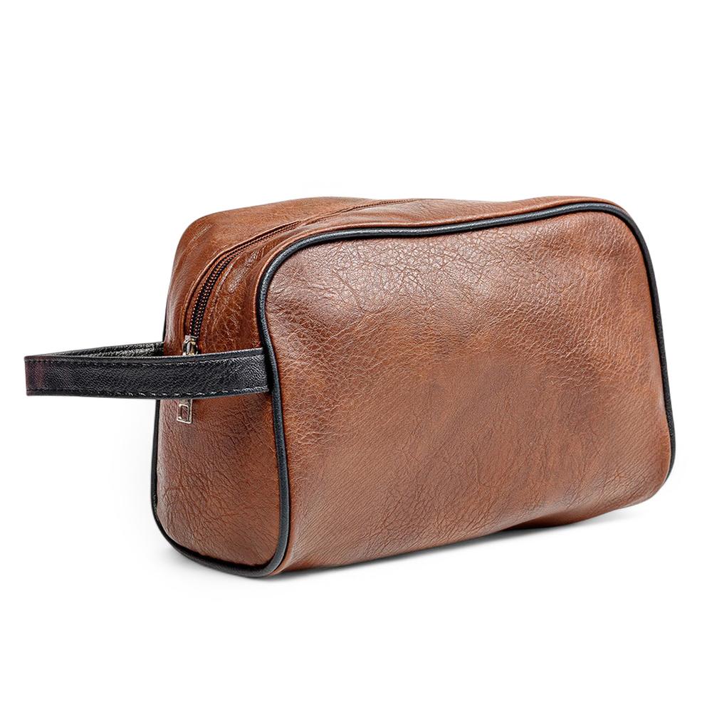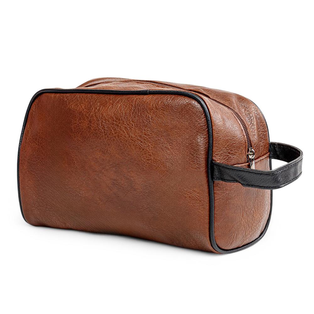 Cosmética lisa con asa café, compartimento con zipper para guardar lo esencial, con diseño clásico y estilo moderno para uso diario.