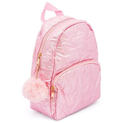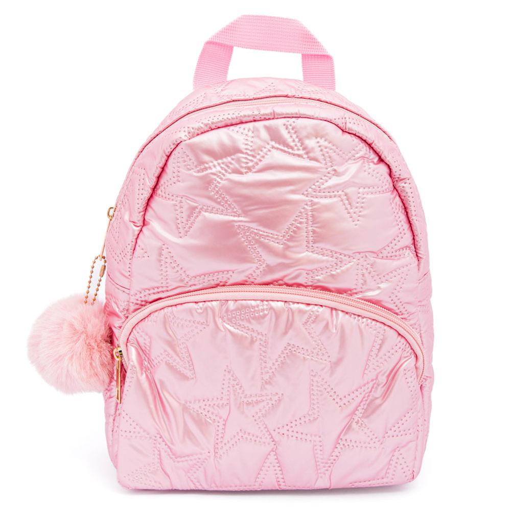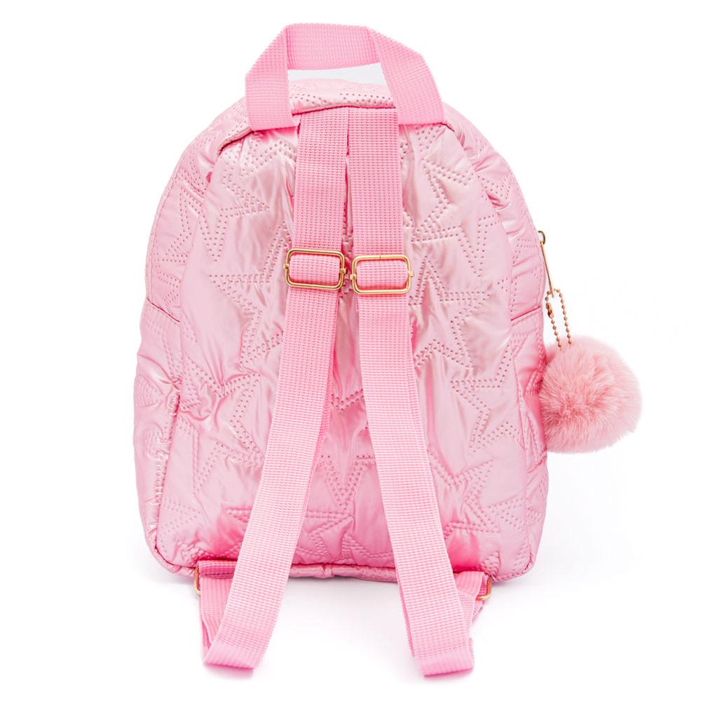 Mochila rosa capitonada con estrellas metálicas y pompón decorativo, ideal para acompañar el estilo de las niñas.