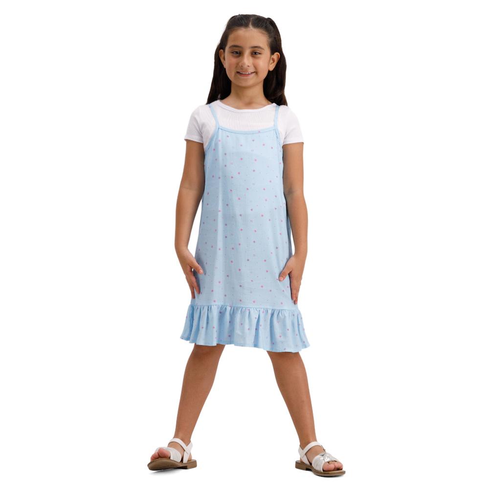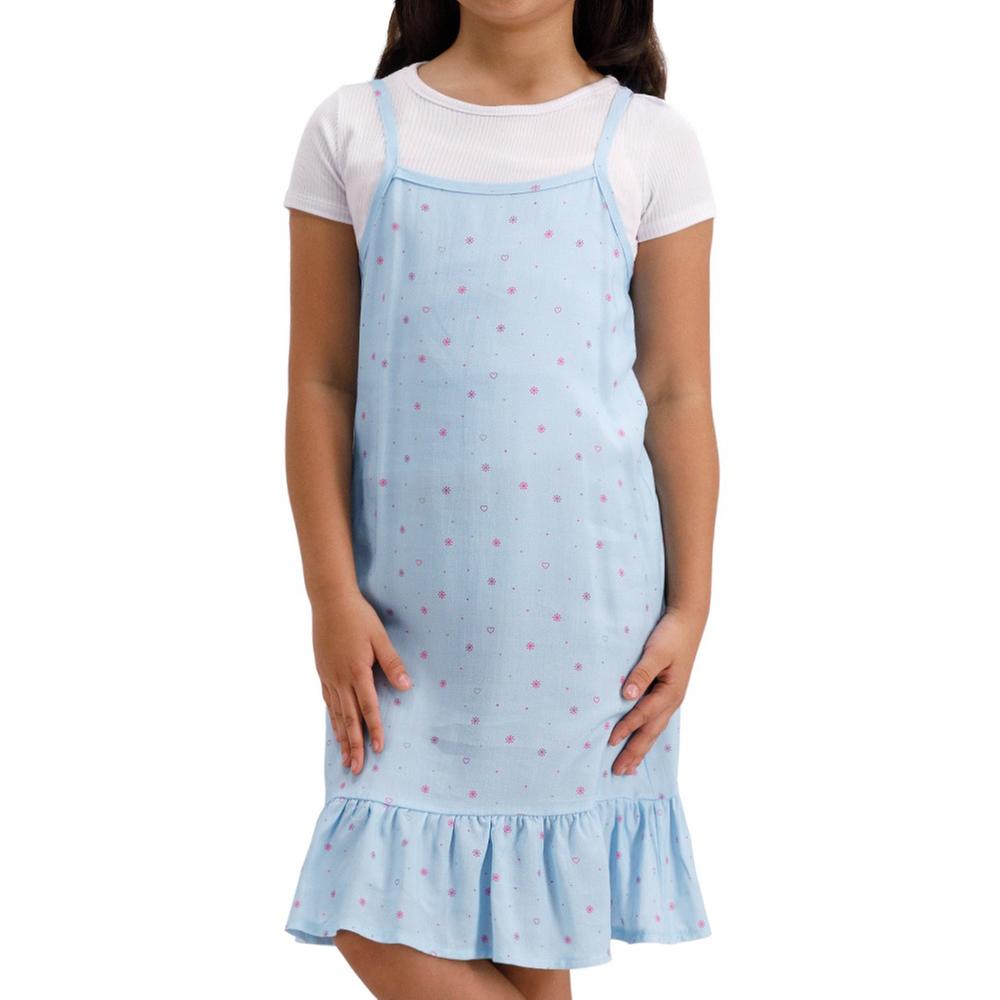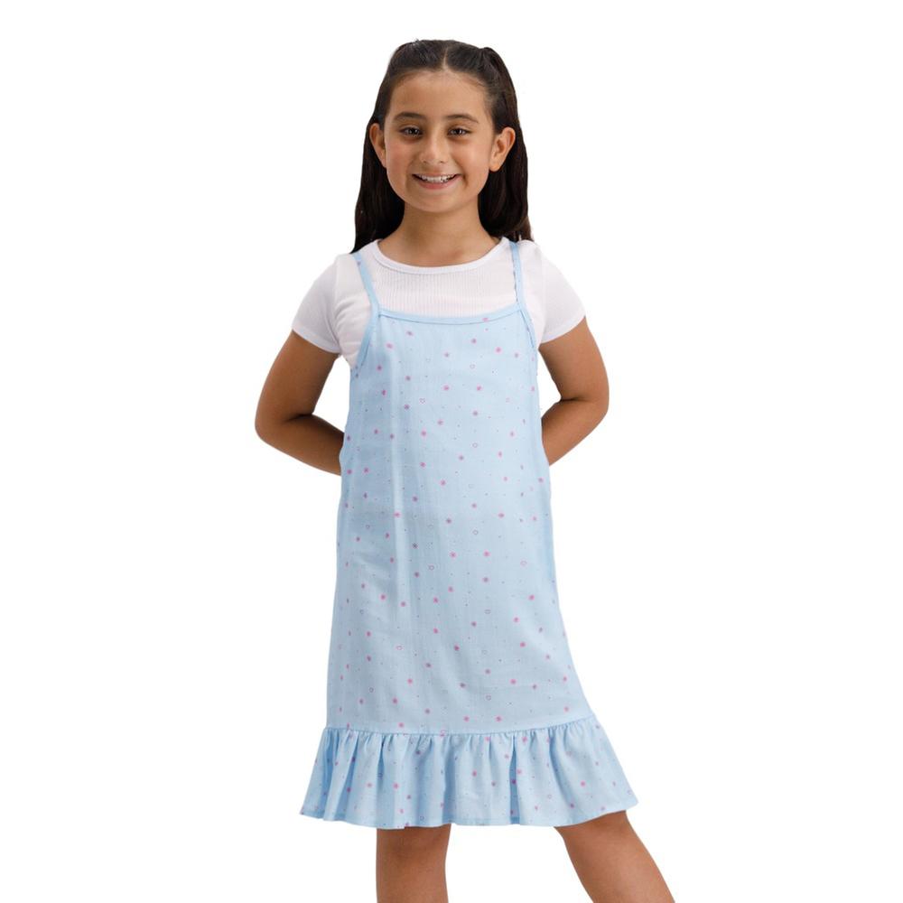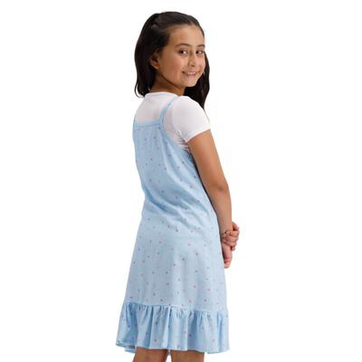 Este conjunto para niña combina diversión y estilo con un vestido encantador de estampado full print y una blusa básica que complementa perfectamente el look, ideal para eventos especiales o para un uso casual con comodidad y frescura.