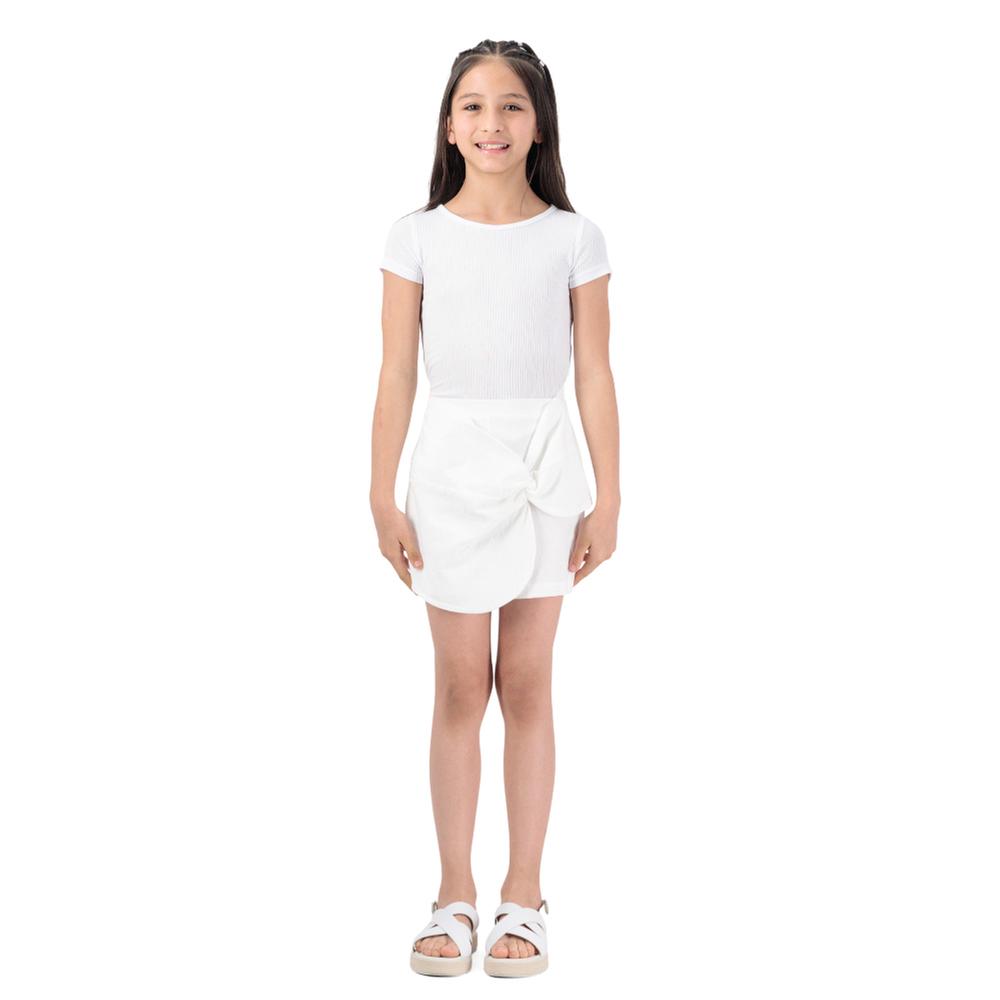 Falda short para niña de diseño liso, ideal para un look cómodo y moderno que combina estilo y libertad de movimiento. Cuenta con elástico en la cintura y amarre frontal, ofreciendo un ajuste seguro y adaptable, mientras que la ausencia de bolsas mantiene un acabado limpio y elegante. Una prenda versátil y práctica para el día a día o salidas casuales.