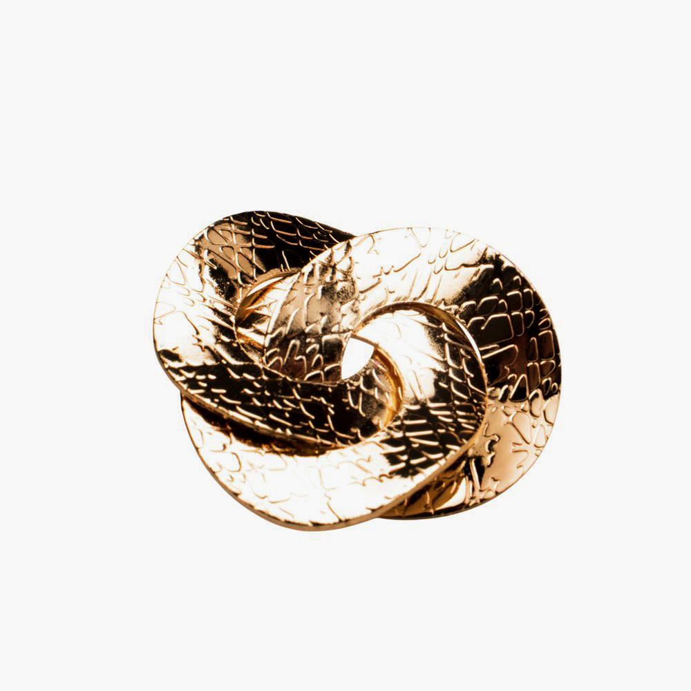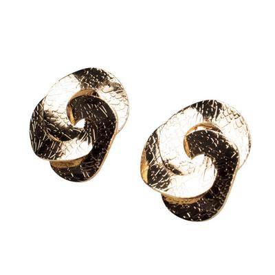 Sofisticación y relieve en una pieza excepcional. Con un acabado de aspecto metálico en tono oro, estos aretes destacan por su diseño entrelazado que aporta volumen y modernidad