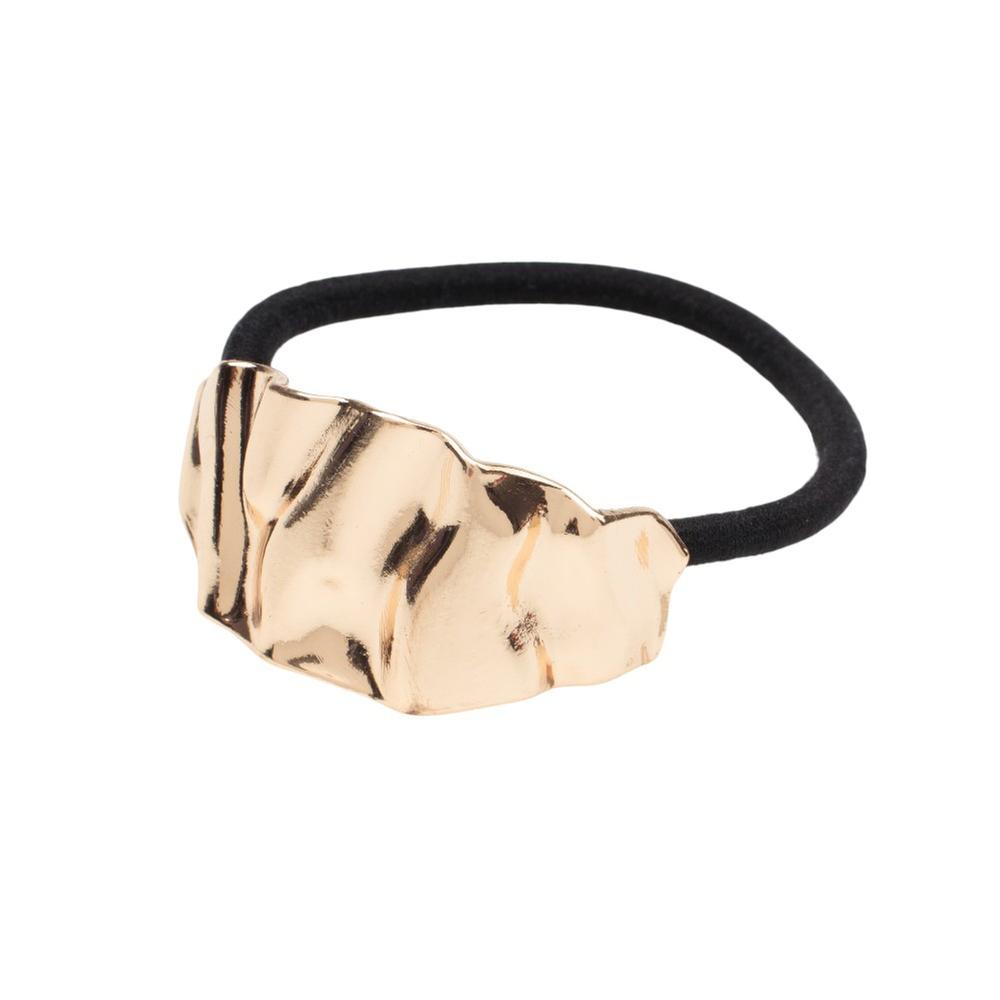 Liga para cabello Mxstaza con elegante detalle metálico dorado, ideal para complementar cualquier peinado con un toque sofisticado. Su diseño práctico y resistente permite sujetar el cabello con comodidad, sin maltratarlo y manteniendo un estilo moderno.