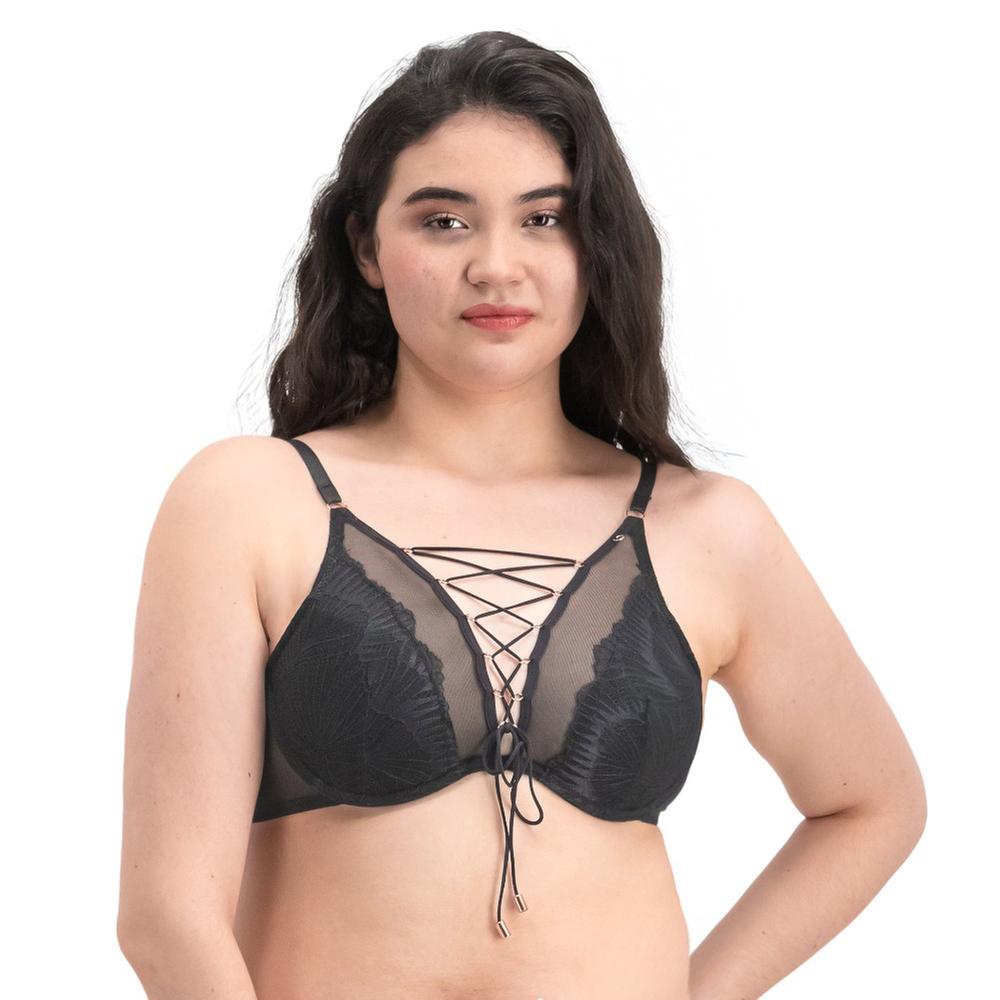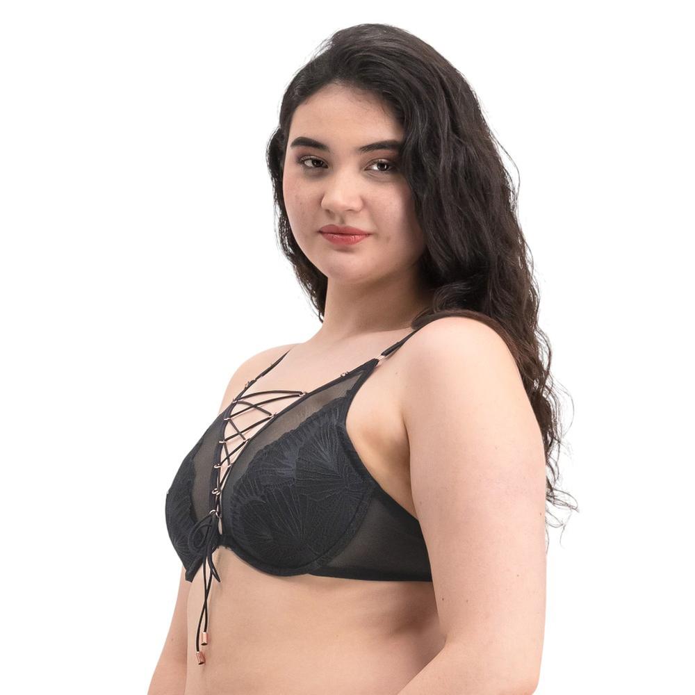 Diseño que enmarca. Este sujetador fusiona un delicado bordado de encaje en las copas con la audacia de los cordones cruzados en el escote. Una prenda atrevida y sofisticada, ideal para complementar escotes profundos.
