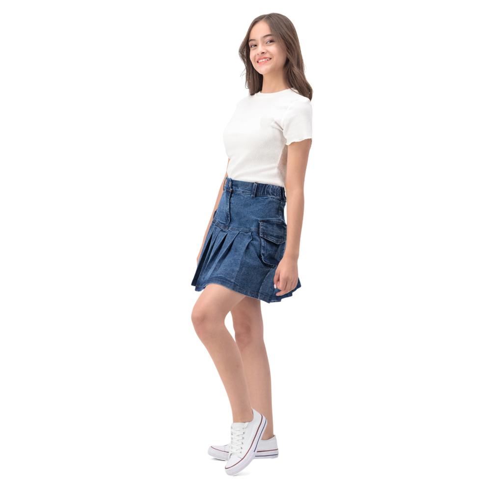 Estilo clásico y moderno se unen en esta falda de mezclilla tableada. Su cintura elástica y bolsas laterales la hacen cómoda, práctica y perfecta para un look urbano o casual.