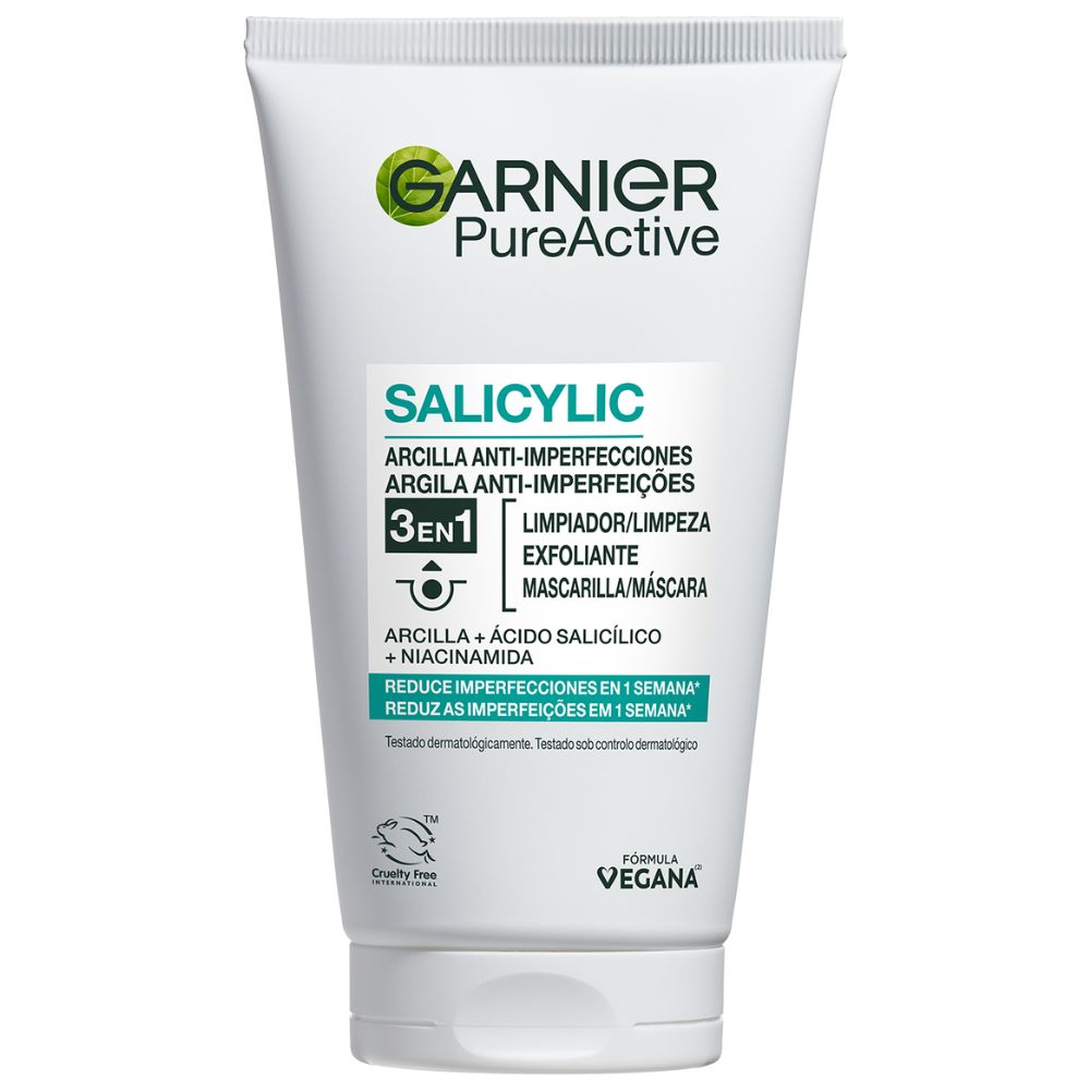 Dale a tu piel el cuidado ideal que necesita con el gel limpiador facial Salicylic de Garnier PureActive y descubre sus 3 diferentes funciones: limpiador, exfoliante y mascarilla. Su fórmula enriquecida con arcilla, ácido salicílico y niacinamida reduce imperfecciones en 1 semana, además disminuye la visibilidad de los poros para una piel limpia y con aspecto uniforme.