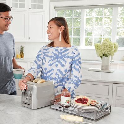 Prepara tostados perfectos con facilidad gracias al elegante tostador de 2 rebanadas Cuisinart ® . Con 7 configuraciones de tostado y opciones de tostadas para pan, bagels, muffins, waffles congelados y pasteles, ¡Toda su familia puede disfrutar de su desayuno favorito exactamente como les gusta!