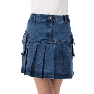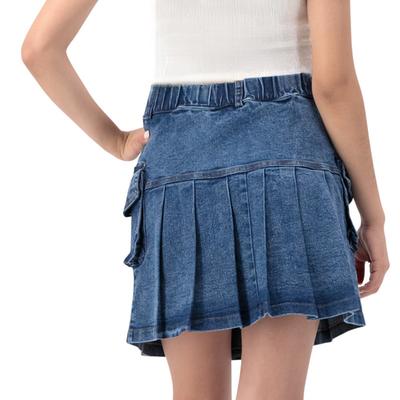 Estilo clásico y moderno se unen en esta falda de mezclilla tableada. Su cintura elástica y bolsas laterales la hacen cómoda, práctica y perfecta para un look urbano o casual.